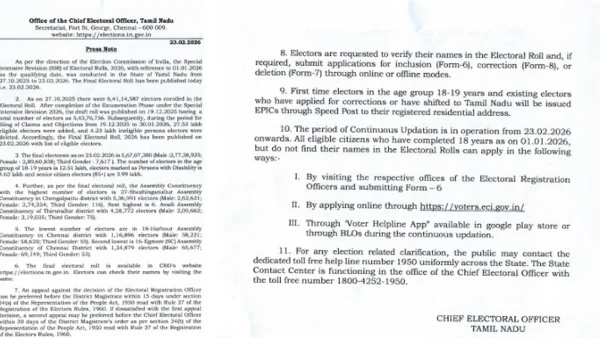 Voters are asked to look at the Tamil Nadu final voter list on the Chief Electoral Officer website, and to use the ongoing updating from February 23 to fix or add entries. People who are able to can apply online or at Electoral Registration Offices using Form-6 to be added, Form-8 to fix, and Form-7 to have someone taken off the list, if needed. First-time voters who are 18-19, and those who have moved to Tamil Nadu, will get Electors’ Photo Identity Cards by Speed Post. By law, appeals against Electoral Registration Officer choices may be made to the District Magistrate within 15 days, with a second appeal to the Chief Electoral Officer within 30 days.