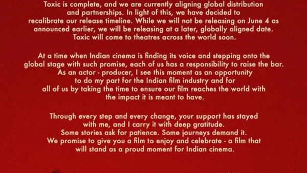 Yash has delayed ‘Toxic’ again; it won’t be in cinemas on June 4th as was originally intended. Yash explained in a formal statement that they’re getting worldwide distribution in place after a very positive reaction from the film industry. A new date for a world-wide release will be announced shortly, and fans are being asked to keep looking for it.